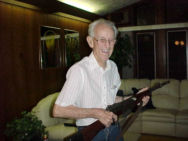 Dad holding one of Arlyn's guns, summer 2001 in Percy