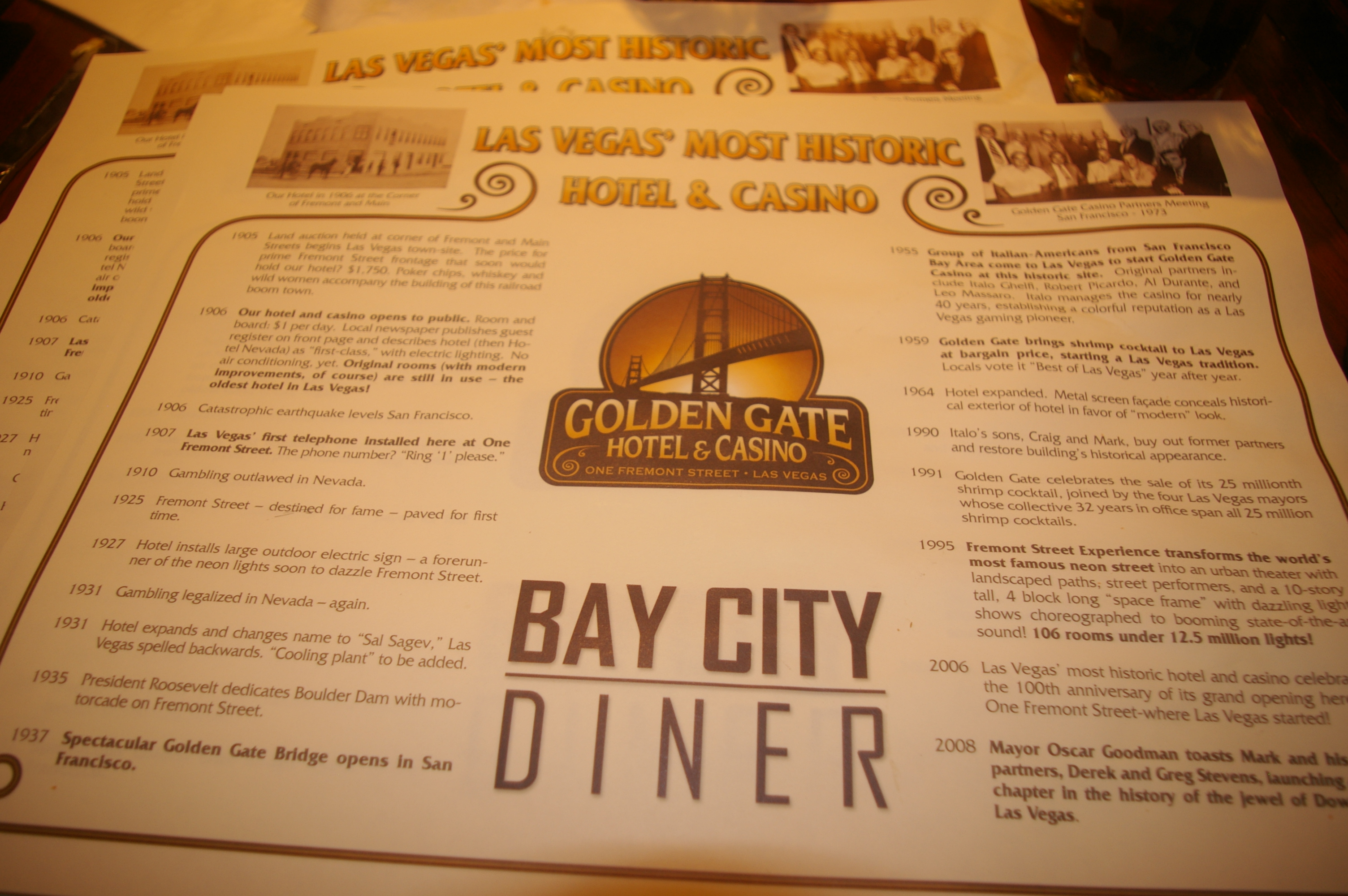 | The menu for the Bay City Diner, a San Francisco theme restaurant inside the Golden Gate Casino. The Hotel and Casino opened the same year of the San Francisco earthquake and fire. Outside the casino on the street was a steel cage that would provide motorcycle entertainment that amazed us. See the video. Also above us was the four block long video display rang out Don McLean's American Pie. | ||||