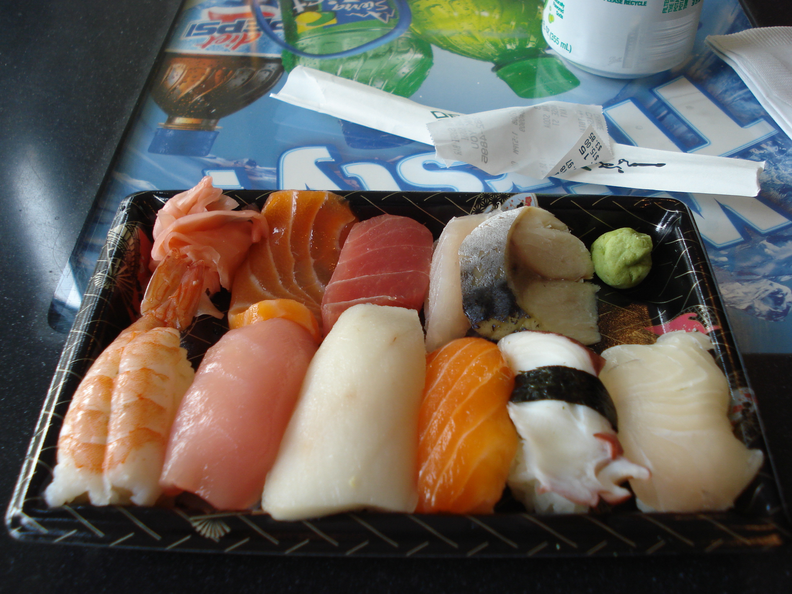 | Sushi!!!! This place was amazing! As I exited the monorail I was hungry and the first place I saw in the mall where we got out was this sushi place. The dish you see here cost only $8.99 and was delicious! This amount of sushi/sashimi would cost about $30 in Gainesville. | ||||