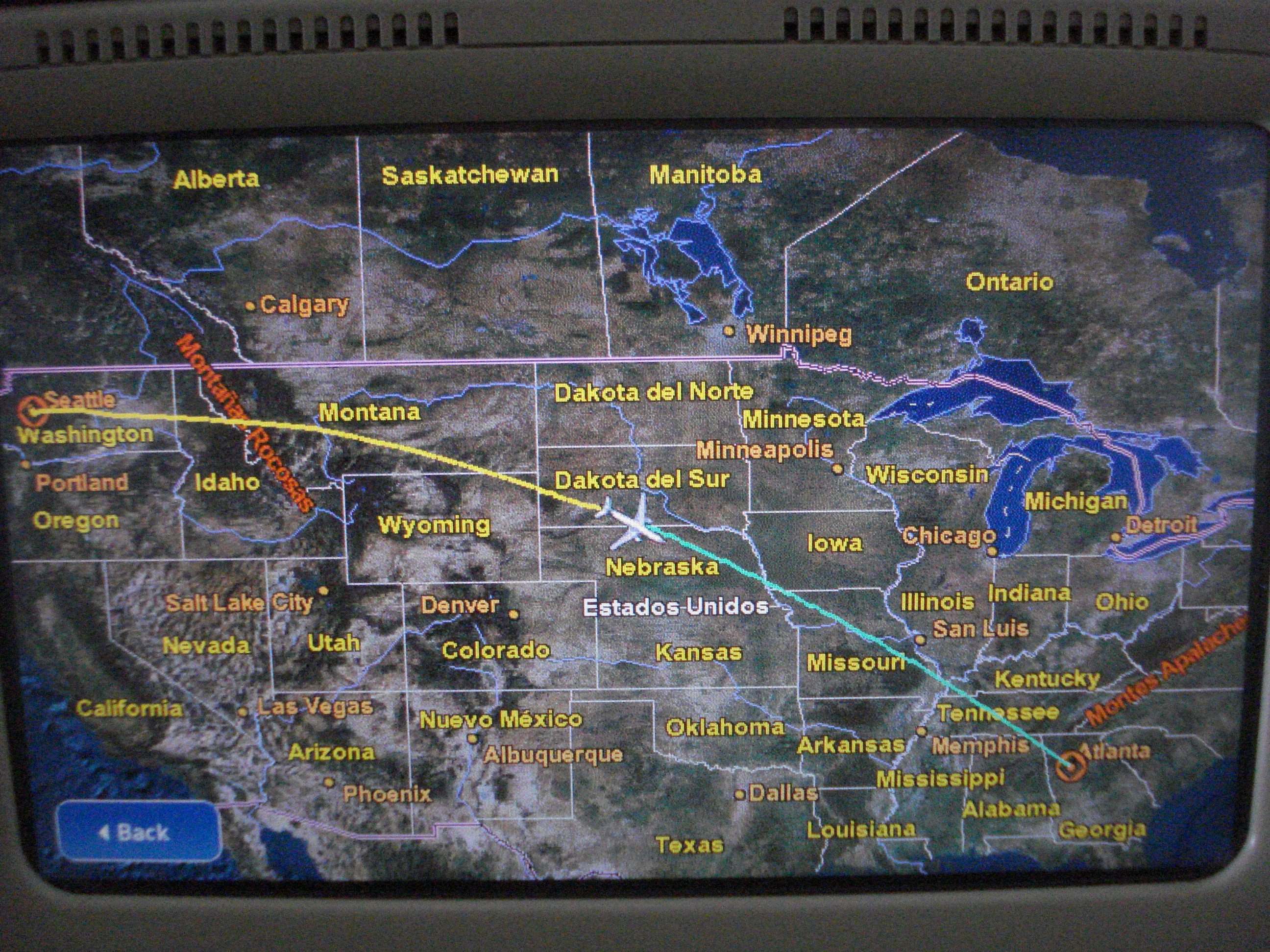 | This map located in the seat back in front of me is what occupied my time on the return flight. It has several different display listing speed, distance travelled, outside temperature, etc. There were two crying babies near me who stayed active the whole flight so napping was pretty difficult. Watching this map, courtesy of Delta Airlines, was entertaining for a long while. | ||||